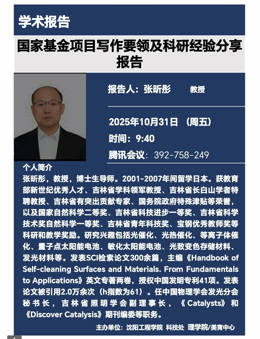 为提升教师国家基金项目申报质量,10月31日,沈阳工程学院科技处、理学院/美育中心联合组织“国家基金项目写作要领及科研经验分享会”,特邀张昕彤教授作线上专题报告,相关学科教师参与学习,本次报告会由理学院教师任婕博士主持。