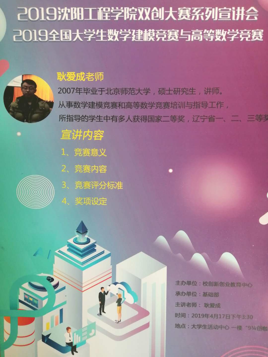 为了激励学生学习数学的积极性,提高学生建立数学模型和运用计算机技术解决实际问题的综合能力,培养学生的创新精神和团队合作精神,同时选拔参加 2019年全国大学生数学建模竞赛的队员,由基础教学部竞赛小组主办的2019年大学生数学建模竞赛将于4月底至5月初举行,现将有关事项通知如下: 1.竞赛时间:2019年4月20日至5月6日16:00; 报名截至止时间:2019年5月3日。 2.报名方式:采用网上报名,请各参赛队队长登录赛氪网进行注册报名。具体流程为:1、登录官网,2、注册账号,3、点击“立即报名”,4、填写参赛队伍信息并提交,5、在个人账户的“我的竞赛”中可以看到已成功参加竞赛的报名信息。报名系统将于4月22日开通。 3.参赛形式:以队为单位参赛,每队最多3名学生。 4.竞赛题目下载:关注大连理工大学创新创业学院微信公众号,竞赛题目将于4月20日通过此平台发布,参赛学生从赛题中任选一题,按竞赛规则独立完成所选题目,校内评奖后从中推荐优秀论文参评2019年东北三省数学建模联赛。 5.答卷要求: (1)答卷写成论文形式,用A4打印纸计算机打印,边距为2.5厘米; (2)论文题目直接用竞赛试题的标题,不要自行拟定,必须标明所选题目的英文字母,封面信息填写务必完整准确; (3)论文第一页、第二页请见附件;论文从第三页开始编页码,第三页打印论文题目、摘要、关键词,第四页开始打印论文;不要页眉,从第三页开始不要有任何答题人身份的信息,否则答卷无效; (4)一级标题用4号,论文其他内容用小4号宋体字、单倍行距,左侧装订;(5)引用他人的成果或资料,在文后的参考文献中列出,正文、变量、公式、图、表、参考文献等格式参见科技类期刊中的标准形式。 6.论文报送:请于5月6日16:00前将竞赛论文以纸质形式交至B104 联系人:毛显 电话:31975753 注意:东三省数学建模竞赛为全国大学生数学建模竞赛的选拔赛,未参加过往年数学建模竞赛的学生必须参加本次竞赛并成功提交参赛论文才有资格参加全国竞赛。  | | 建模竞赛宣讲会海报 | |