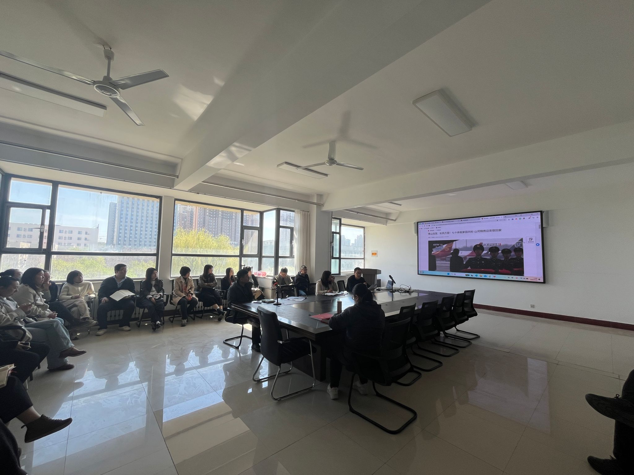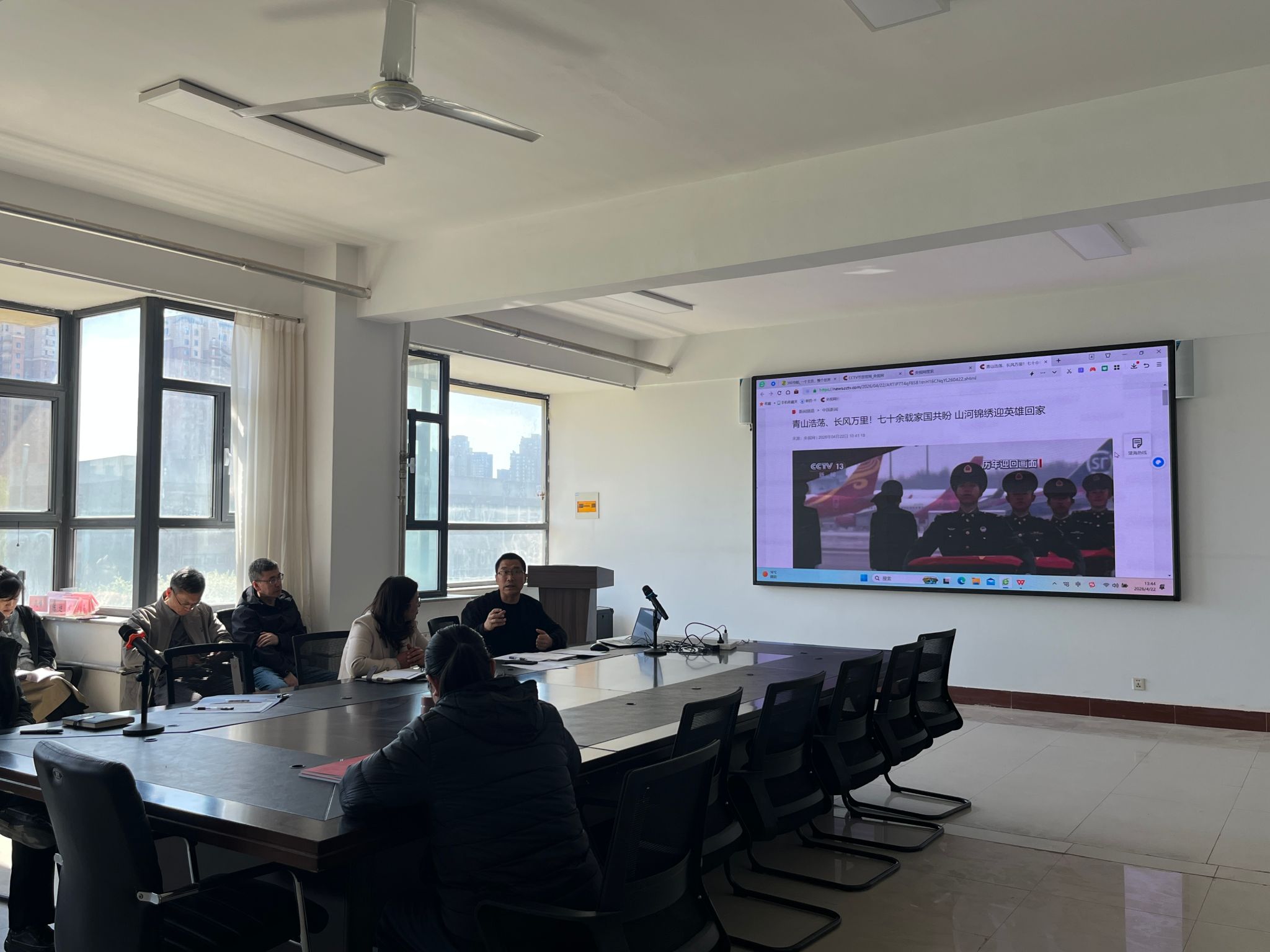 4月22日,理学院根据学校统一安排,开展特殊党日活动,组织全体教师集中观看第十三批在韩志愿军烈士遗骸迎回仪式相关报道,并结合部门实际情况,研究部署传承弘扬伟大抗美援朝精神的大思政课,推动将抗美援朝精神融入学校教育教学全过程,进一步激发广大师生的爱国之心、强国之愿、报国之志。