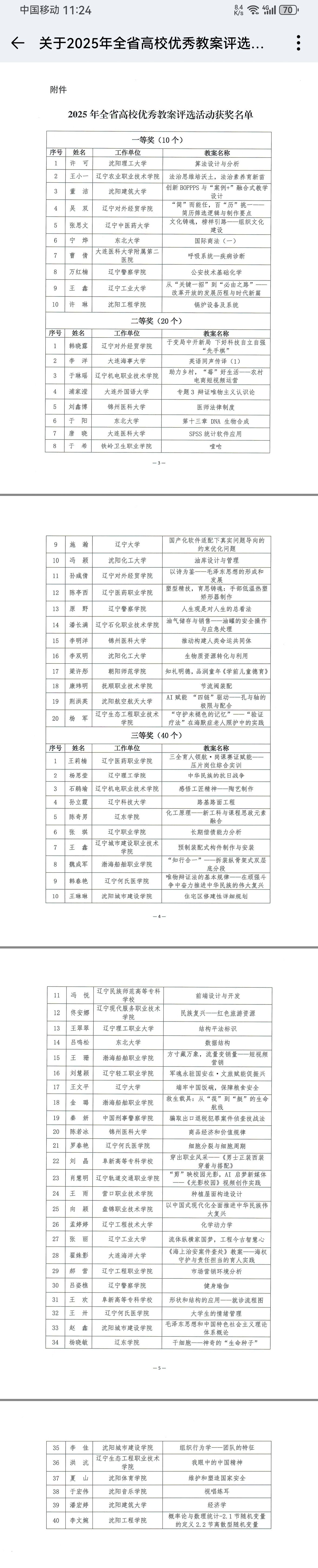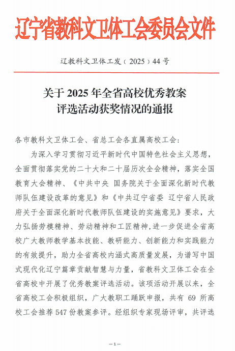 近日,辽宁省工会印发《关于 2025 年全省高校优秀教案评选活动获奖情况的通报》(辽教科文卫体工发〔2025〕44 号)。我校教师凭借深厚的教学积淀、扎实的专业功底与创新性教学设计崭露锋芒,在此次评选中斩获佳绩!其中,理学院李文婉老师的教案因突出的实用价值与独特的教学亮点获评三等奖。