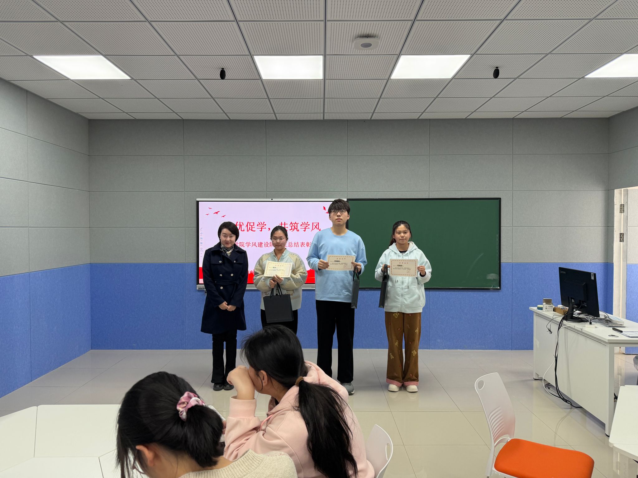 会上,高等数学任课教师陈钢就大一第一学期高等数学学习情况作总结发言。随后进入颁奖环节,依次颁发高等数学期末考试成绩三等奖、二等奖、一等奖,并对一次性通过大学英语四级考试的大一学生进行表彰。